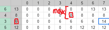 즉, dp[2][7]을 구할 때, 위의 사진과 같이 구했다는 것이다. 이것을 코드화 했을 때 중요한 포인트가 있다. 바로 해당 열에서의 max값을 어떻게 구하냐는 것이다. 나는 maxDp라는 배열을 도입하여 시간을 단축시켰다. 위 사진에서의 maxDp는 [0, 0, 0, 0, 8, 8, 13, 13]이다. 즉, 이전 열까지의 dp의 최댓값을 저장하는 배열이다. 주의해야할 점은, 현재 열에 대해서 dp값에 대입연산을 모두 마친 후에 maxDp를 갱신시켜야한다는 점이다. 이것을 코드화하면 아래와 같다.