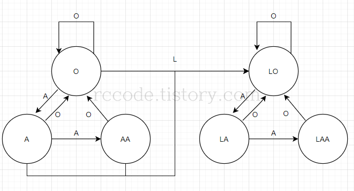 진행은 맨 뒤에 문자를 하나 붙이는 식이다. 예를 들어, AA 상태인 "OAA"에 L을 붙여서 "OAAL", 즉 LO 상태가 된다.