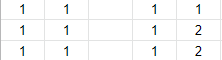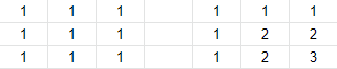 눈치를 챘을지 모르겠지만, DP의 값은 왼쪽, 위쪽, 왼쪽위 대각선의 것을 참조한다. 하지만, 단순히 3개의 값이 같을 때 그 값에서 1을 더하는 것이 아니다. 아래의 케이스를 보자.