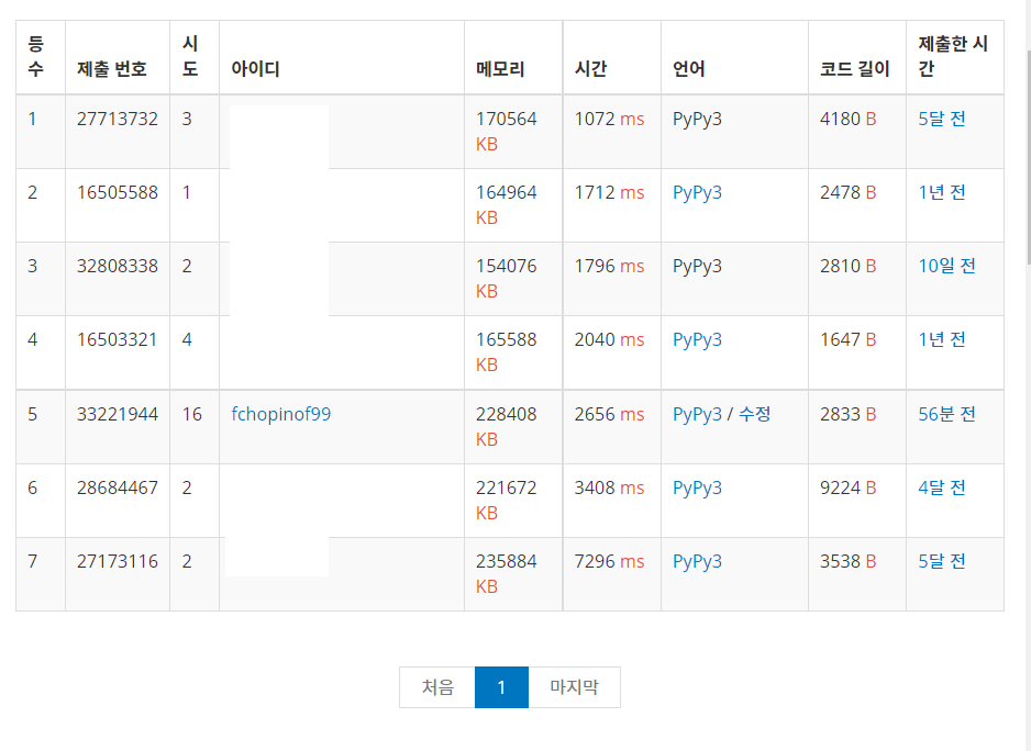 시간, 공간복잡도는 평범~느린 편에 속한다. 참고로 Python으로 성공한 사람은 없으며 Pypy3으로 제출해야한다.