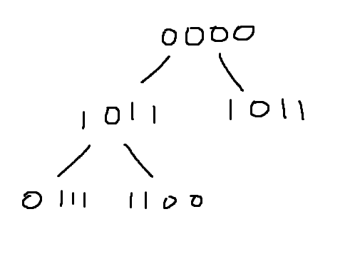 여기서 결론짓자면, xor 연산을 할 값을 lazy 저장한 뒤에, propagate를 할 때 대상 노드가 가리키는 노드의 개수가 홀수일 때만 트리값을 변경하면 된다. 예를 들어, 방금 든 예시에서는 1011이라는 노드가 0~1, 즉 짝수만큼의 노드를 가리키므로 트리를 수정하지 않고 lazy값만 전달하게 된다. 반대로 위 사진에서의 루트 노드인 0000은 0~2(개수가 홀수)를 가리키므로 xor 연산을 1번 해준 뒤 전파해준다.