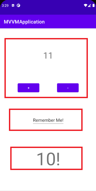 맨 위는 +, - 버튼을 눌러서 count 값을 조절할 수 있는 영역이고, 가운데 박스는 뷰모델에 실시간으로 값이 양방향으로 전달되는 단순한 EditText이며, 밑에 있는 10!은 count 값이 10 이상일 때만 보여지는 TextView이다. 어떤 목적을 위해 설계된 어플리케이션이라기보단, 이 글에서 다룰 핵심 요소들을 설명하기 위한 수단에 불과하다.