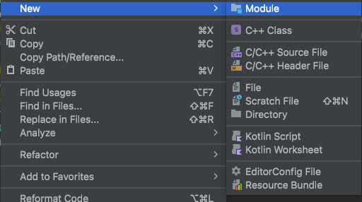 먼저 프로젝트 최상위 폴더에 우클릭한 뒤, New > Module을 클릭합니다.