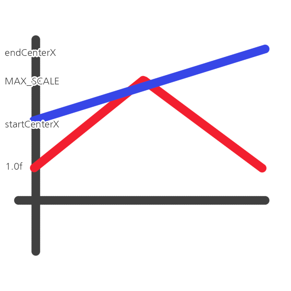 이를 위해 먼저, animatedValue가 startScale(1.0f가 아닌 이유는, 이전 애니메이션이 끝나지 않았을 때 시작되는 경우를 처리하기 위함입니다.) -> MAX_SCALE -> 1.0으로 변하게 되는 ValueAnimator를 구성합니다. 이렇게 되면 인디케이터의 width를 INDICATOR_WIDTH*animatedValue를 통해 구할 수 있게 됩니다.
