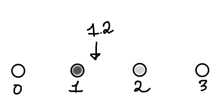선택된 인디케이터 색상이 검정색, 그렇지 않은 일반 인디케이터 색상이 흰색일 경우를 생각해보겠습니다.(여기서 width는 고려하지 않겠습니다.) absoluteOffset이 위와 같이 1.2 정도라면, 1번째 인디케이터의 색상은 검정색*0.8 + 흰색*0.2, 2번째 인디케이터의 색상은 검정색*0.2 + 흰색*0.8이 될 것입니다.