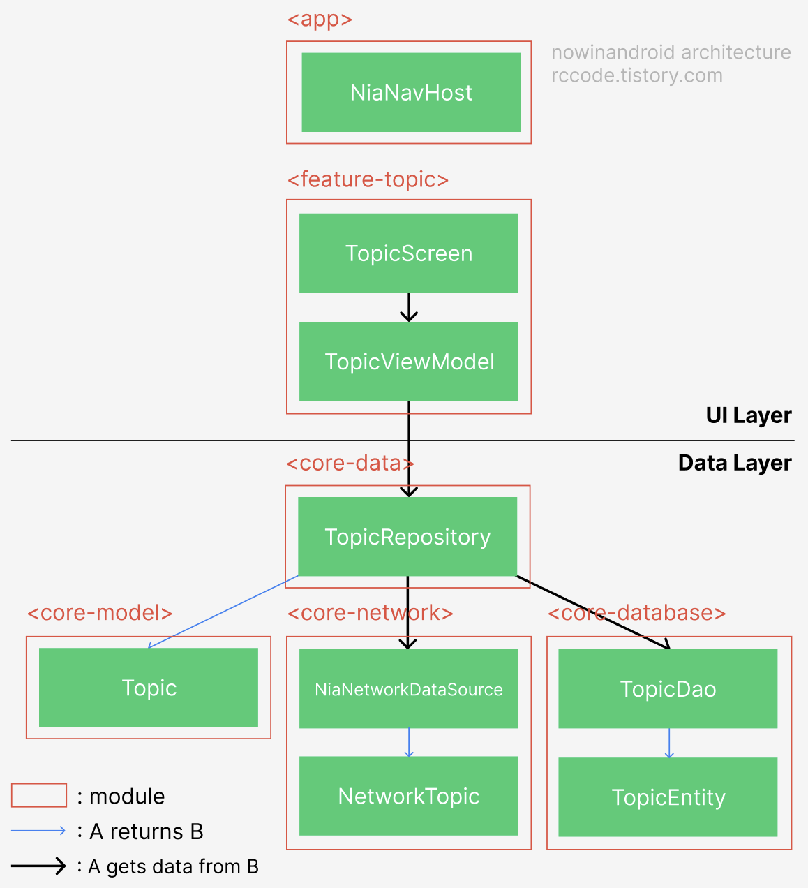 아래 사진은 Topic과 연관된 클래스를 모듈과 레이어를 기준으로 구분한 사진입니다. 각 레이어 내 요소들이 어떤 책임을 지는지를 nia 앱 내의 여러 기능들 중 'Topic'을 기준으로 내용을 설명하겠습니다.