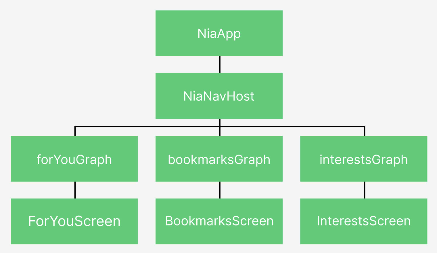 2. NavHost 내부에 forYouGraph, bookmarksGraph, interestsGraph를 두게 됩니다.