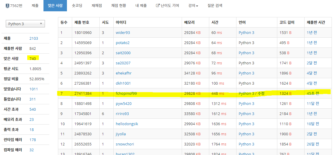 시간 복잡도는 상위 1%이며, 압도적으로 빠른(60ms~100ms)와 평균 수준(1600ms~)의 어느 한 부분에 위치해있다.