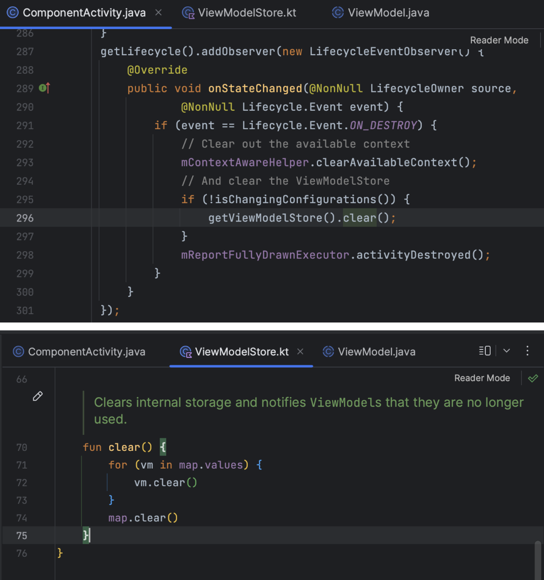 - Activity나 Fragment가 파괴될 때, ViewModel의 onCleared() 메소드가 호출되어 정리(clean-up) 작업이 수행됩니다.