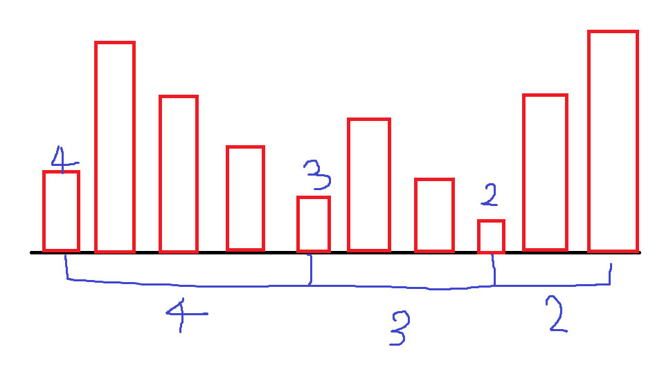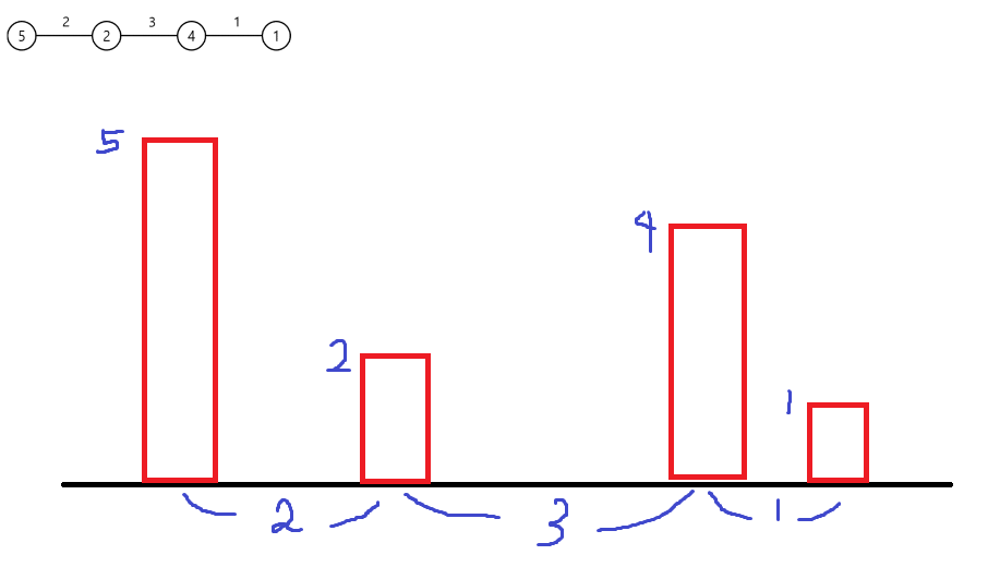 즉, 주유를 할 때 생각해야하는 것은, '다음에 이곳보다 싼 곳까지 도달할 정도로 주유를 한다. 이곳이 가장 싸다면 모든 거리에 대해 주유를 한다.'이다. 이 생각을 기반으로, 이제 예시로 주어진 케이스에 대해 거리까지 생각을 해보자.