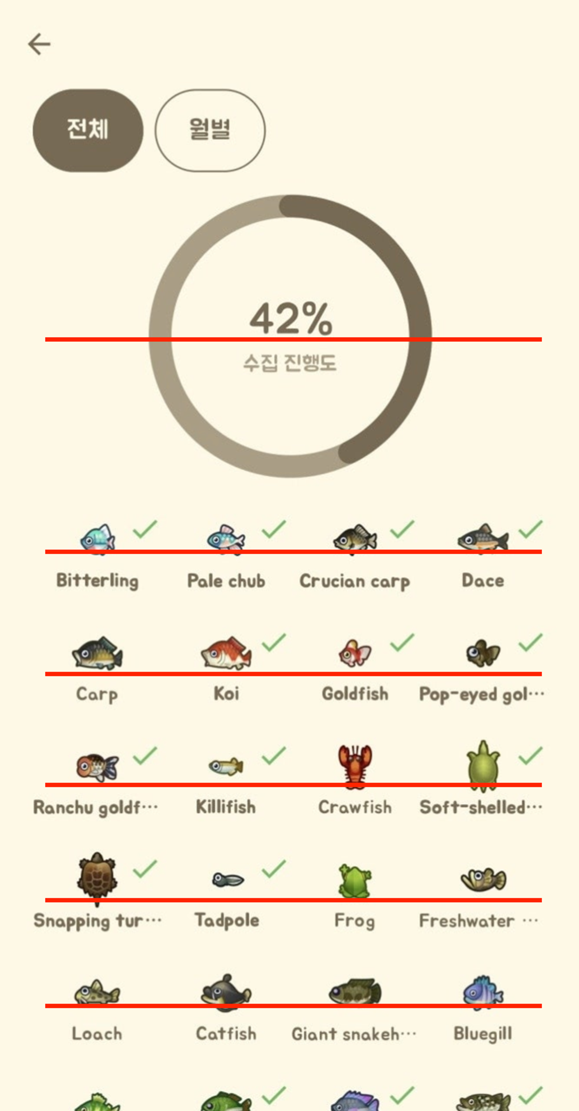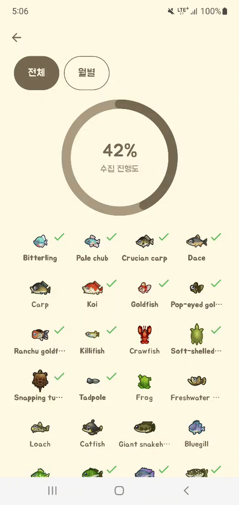아래 화면에서 수집 진행도(NkAnimatedCircularProgress)와 물고기 그리드(LazyVerticalGrid)의 스크롤을 병합하고 싶었다.