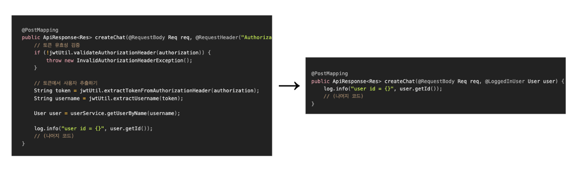 위 코드에선 Authorization 헤더에서 JWT를 통해 username을 추출하고 UserService에서 사용자를 가져오고 있습니다. 10줄이나 되는 이 로직은 다른 함수에서도 자주 쓰이게 될 일반적인 코드이므로 간소화하고자 합니다.