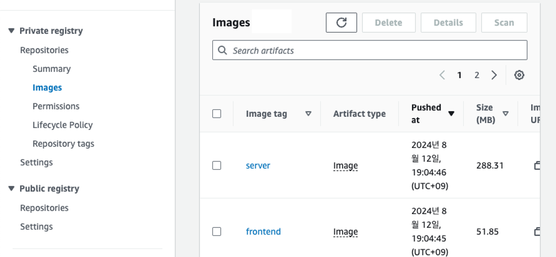 이후 도커 푸시를 하고 ECR 서비스 페이지에서 확인(ECR - Repositories - (원하는 repository 선택) - Images)해보니 제가 푸시한 이미지를 확인할 수 있었습니다.