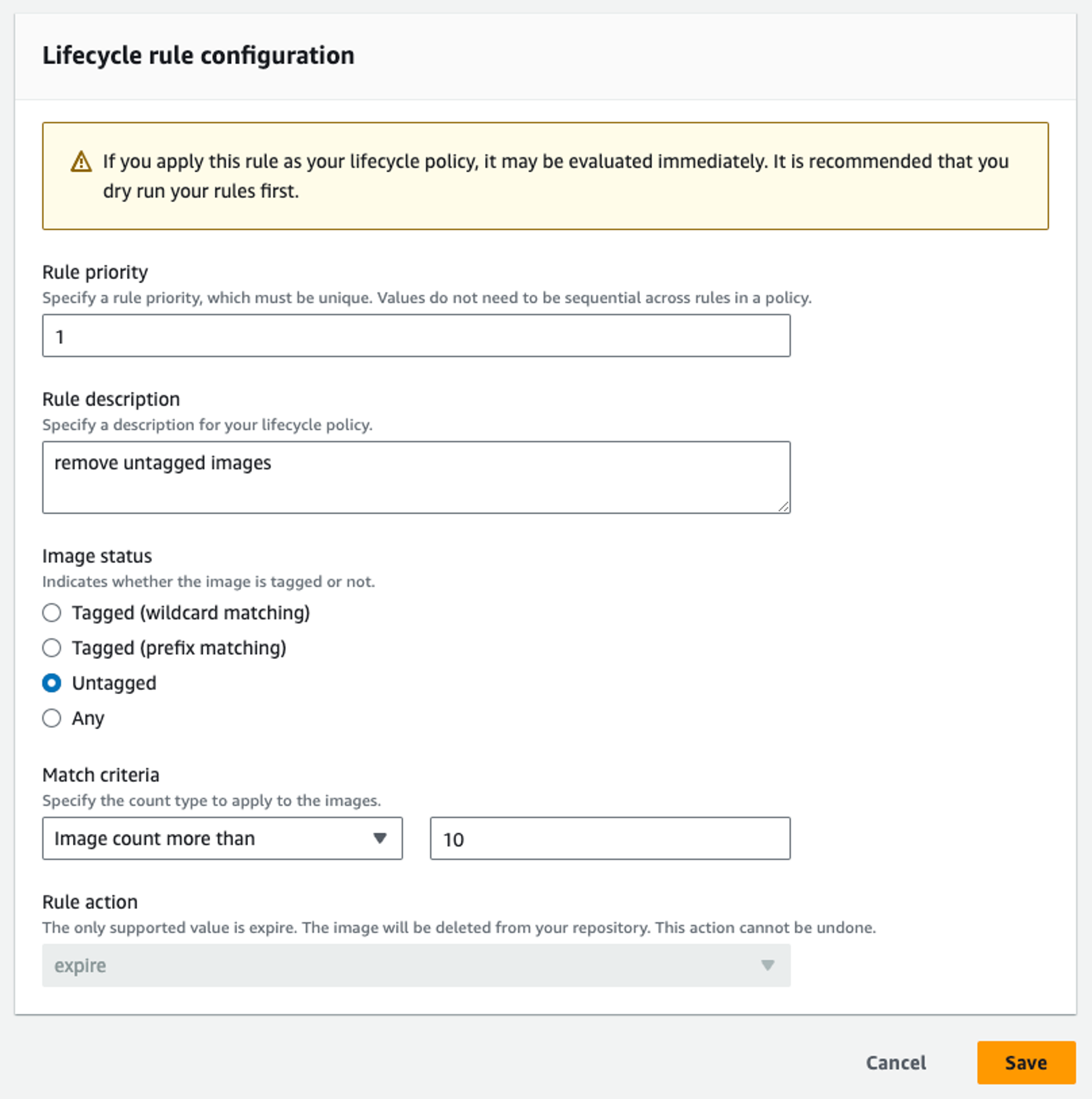 같은 태그로 이미지를 여러 번 푸시하면 가장 최신 이미지를 제외하고 모두 태그가 사라지기 때문에, 타겟 Image status를 untagged로 설정하였습니다. 또한 그런 이미지가 10개를 넘지 않도록 설정하였습니다. 즉, 최신이 아닌 이미지가 10개가 넘지 않도록 제한을 둔 것입니다.